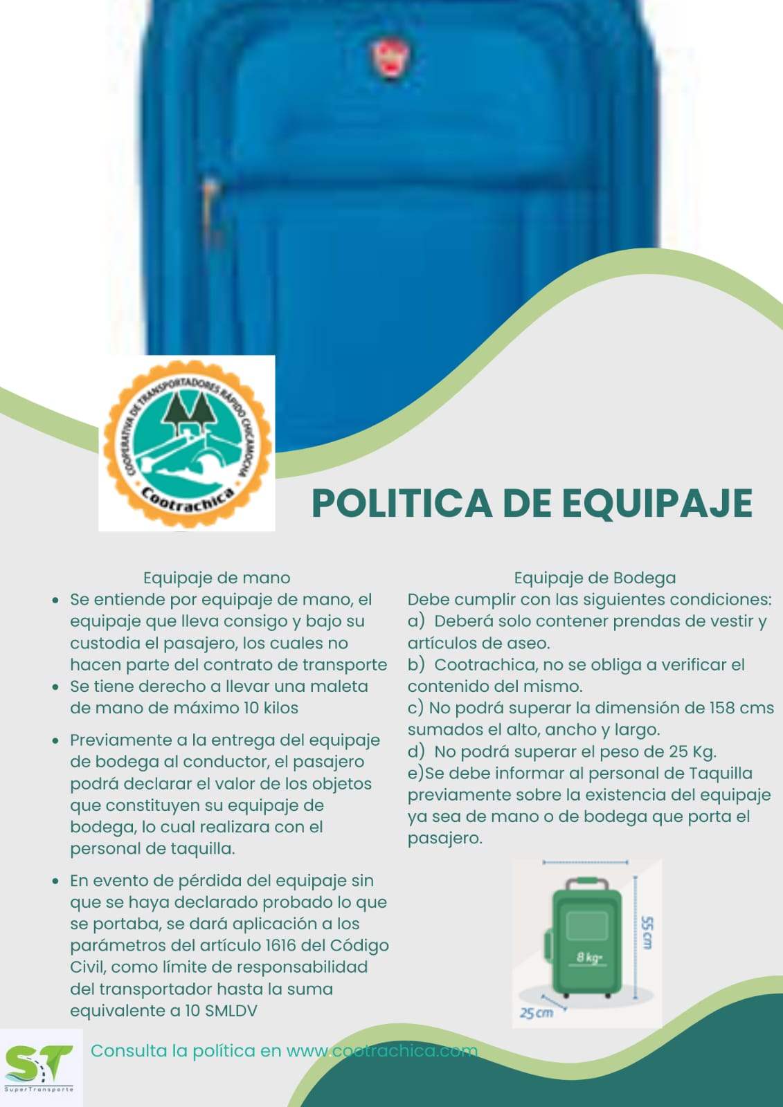 Cootrachica informa a todos nuestros usuarios del servicio intermunicipal las condiciones de viaje para la prestacion de servicio de transporte a nivel nacional, esta informacion estara presente en nuestras redes sociales y sitios oficiales de la Cooperativa, asi como en nuestras diferentes agencias.